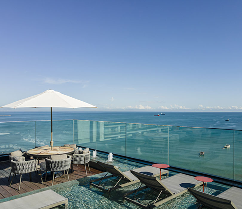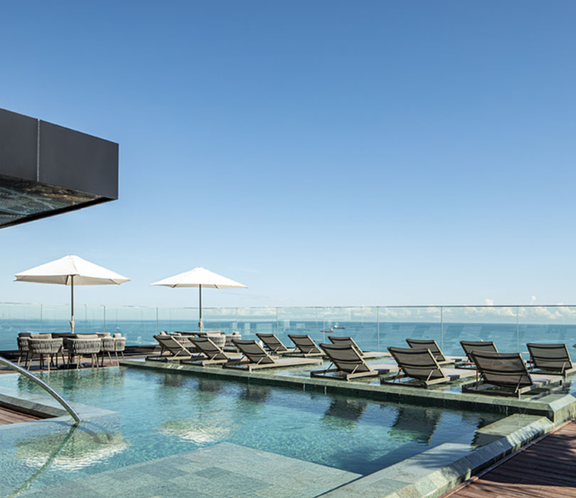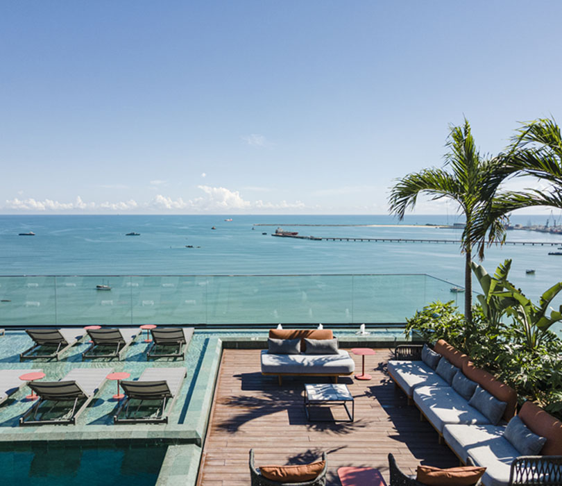 Piscina com borda infinita conectada aos verdes mares de Fortaleza. Prepare-se para apreciar o incrível pôr do sol da cidade.